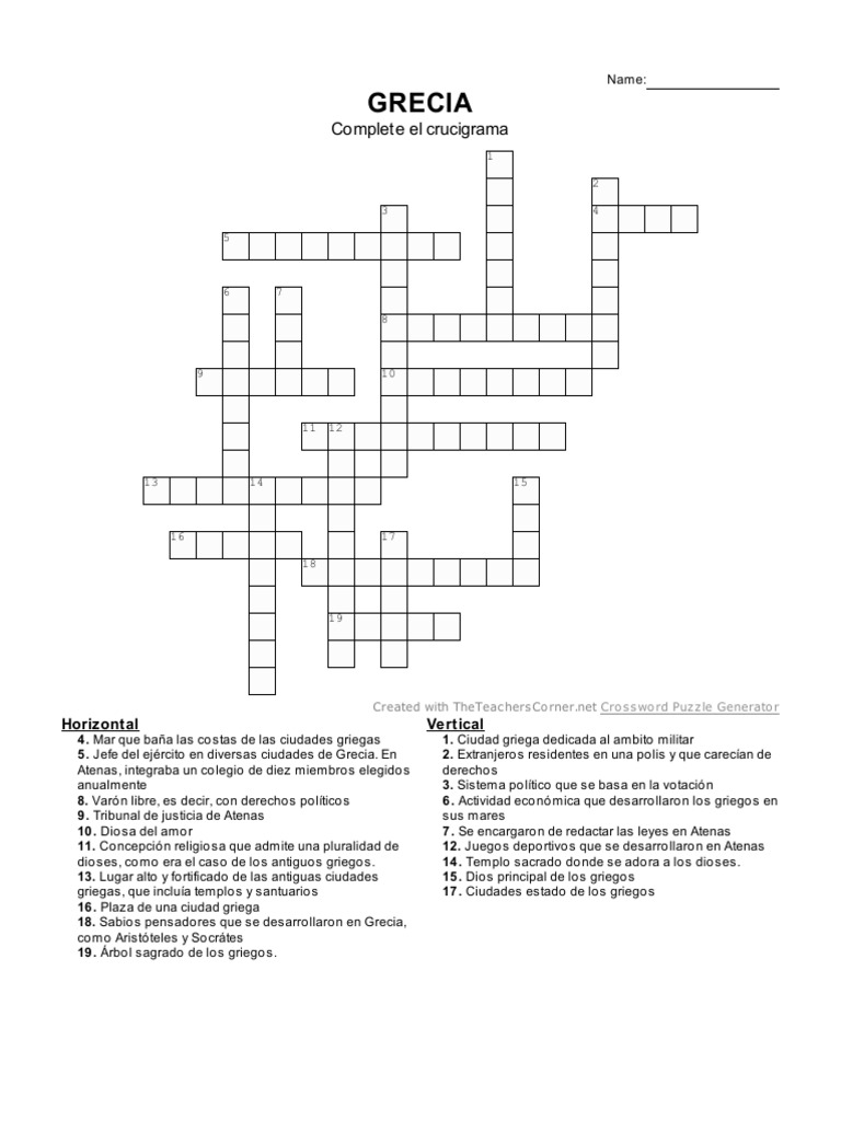Sabio griego crucigrama. 20 Ejemplos De Crucigramas + Descargables (Con Respuesta)... El crucigrama es una actividad de pasatiempo que consiste en descubrir palabras que se La estructura del crucigrama tiene espacios en blanco con pequeñas numeraciones donde van las... Crossword Puzzle: Crucigrama alfabeto griego (crucigrama) Crucigrama alfabeto griego. Crossword Puzzle. Completa el crucigrama con el nombre de las diferentes letras griegas. Get Premium. crucigrama Recommended age: 12 years old. Ejemplos de Sufijos Griegos Son sufijos griegos los siguientes -grama→ letra: crucigrama (juego que consiste en encontrar ciertas palabras y ponerlas en casilleros). Cómo hacer crucigrama en Word paso a paso | plantilla descargable Aprende a crear un crucigrama en Word. Microsoft Word es una herramienta que todos tenemos instalada en nuestro PC, además de editar textos, también podemos utilizarla para otras labores.