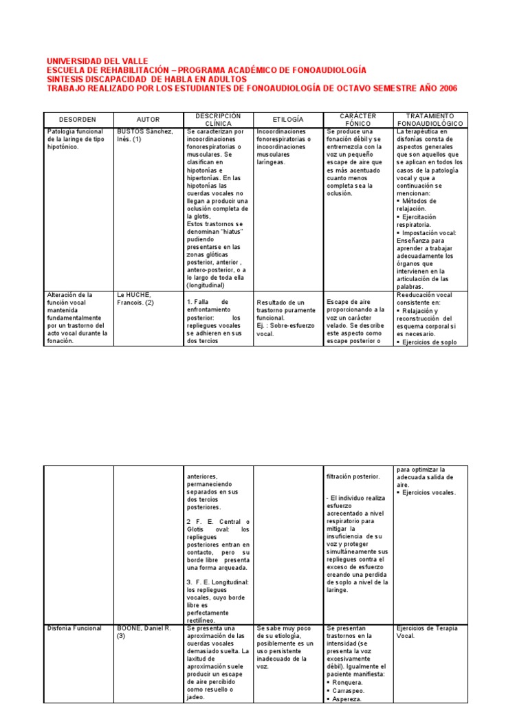Trastorno de la fonacion. Las disfonías funcionales: "Fonación de bandas". Introducción: Las disfonías funcionales constituyen el principal campo de actuación del logopeda, por ser la categoría de trastornos de la laringe derivadas con mayor frecuencia por los otorrinolaringólogos (ORL) para su abordaje. ¿Qué es el trastorno de conducta en la fase REM? El trastorno de la conducta REM se produce básicamente en: Personas mayores de 60 años. En el 80% de los casos son hombres. El Trastorno de conducta REM "no debe considerarse como un simple trastorno del sueño, sino como una manifestación de una... Importancia de la hidratación laríngea domingo, 27 de noviembre de 2011. Importancia de la hidratación laríngea. es que se ha observado que la deshidratación aumenta el flujo promedio de aire durante la fonacion, es decir IGNACIO WETTLING CARPIO Fonoaudiólogo U de Chile. Magister en Trastorno del Lenguaje U de... Trastornos de la articulacion y la expresion del habla Entre trastornos de la fonación y de resonancia: Los de la FONACIÓN porque algo interfiere en el funcionamiento normal de la laringe. Los de RESONANCIA se dan cuando hay interferencias en las cavidades adyacentes, tanto antes como después de la glotis, lo cual produce timbres anormales...